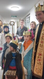 Le 10 janvier, j’accompagnais 5 chanteurs de l’étoile au foyer Vinzirast-Cortihaus pour des personnes en réinsertion après avoir vécu dans le rue. Ceux-ci, magnifiquement déguisés et bien préparés pour la récitation de leur texte et le chant des hymnes, sont passés d’appartement en appartement pour apporter la Bonne Nouvelle du Salut aux confins du monde et aux périphéries existentielles. Pour beaucoup, cette tradition est l’occasion de plonger avec émotion en enfance, lorsqu’eux-mêmes portaient l’étoile, le turban et se faisaient gâter de sucreries à chaque maison visitée. Peu à peu, la joie a gagné tout le foyer, et beaucoup des personnes visitées n’ont pu s’empêcher de se joindre à la procession et nous suivre dans les appartements suivants. L’un des pensionnaires avait d’ailleurs sorti son accordéon et jubilait d’accompagner les chants, tout en testant la culture musicale des enfants avec des mélodies de Noël de chez lui. La tradition veut également que les enfants récoltent quelques donations pour une bonne œuvre.